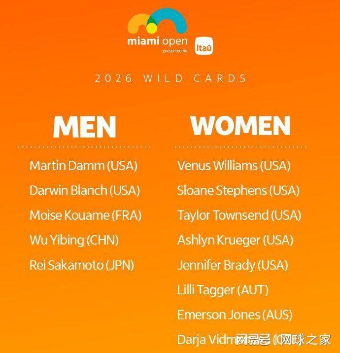 我们再来关注其它消息。北京时间今晨,ATP/WTA1000迈阿密站公布了单打正赛外卡名单。男子方面:中国一哥吴易昺和夸梅、布兰奇、坂本怜、达姆四人入围;女子方面:大威廉姆斯、斯蒂芬斯、汤森德、克鲁格、布拉迪、塔格尔、琼斯、维德曼诺娃榜上有名。