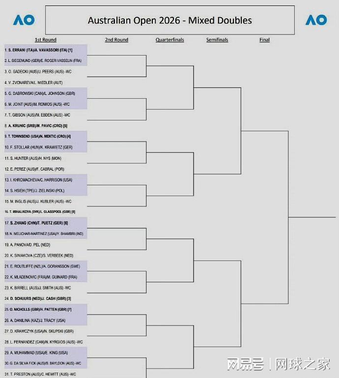 另外,北京时间昨晚,澳网公布了混双签表,中国老将张帅搭档德国人普埃茨出战,首轮对阵梅里查尔/班布里。